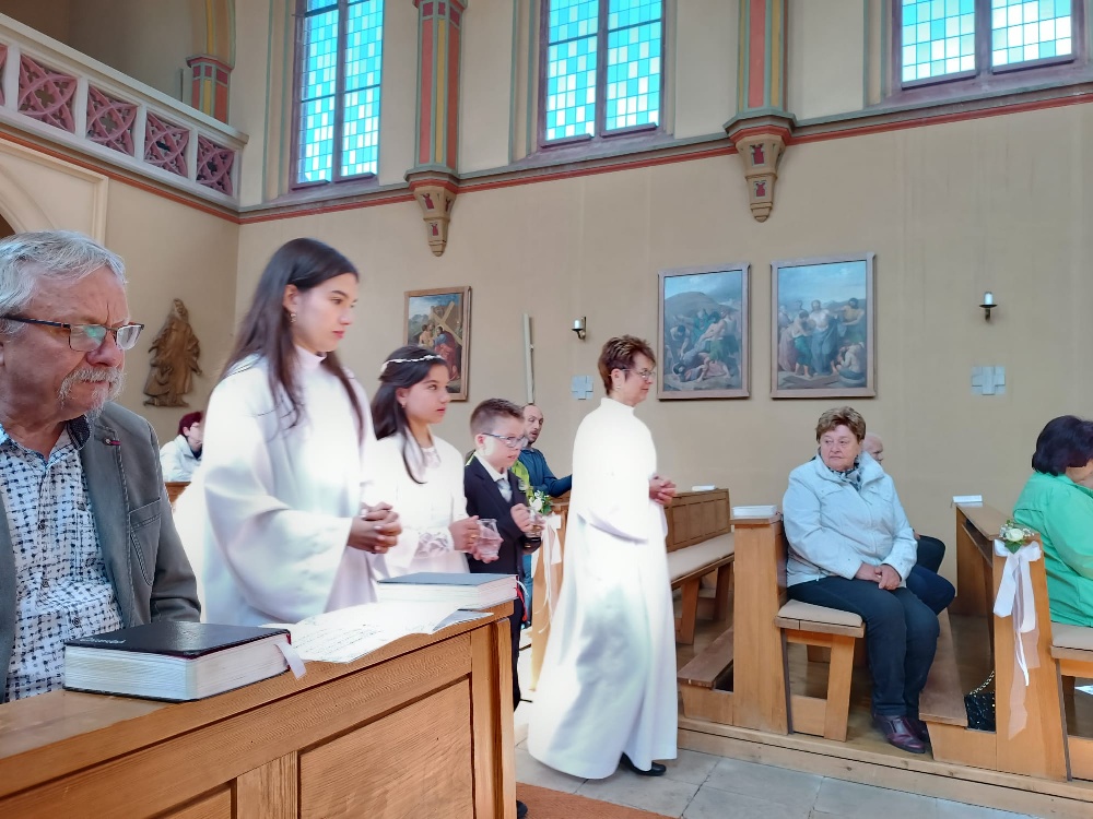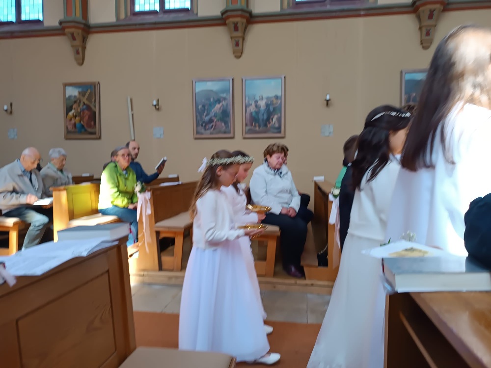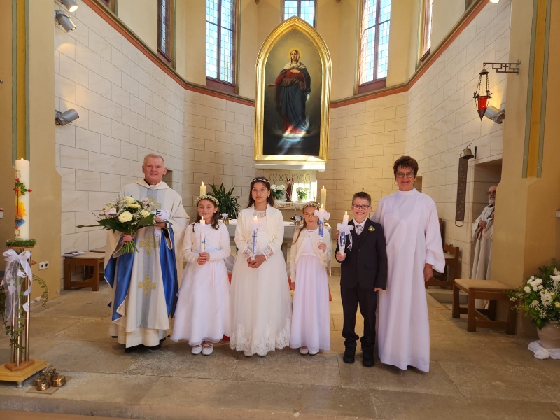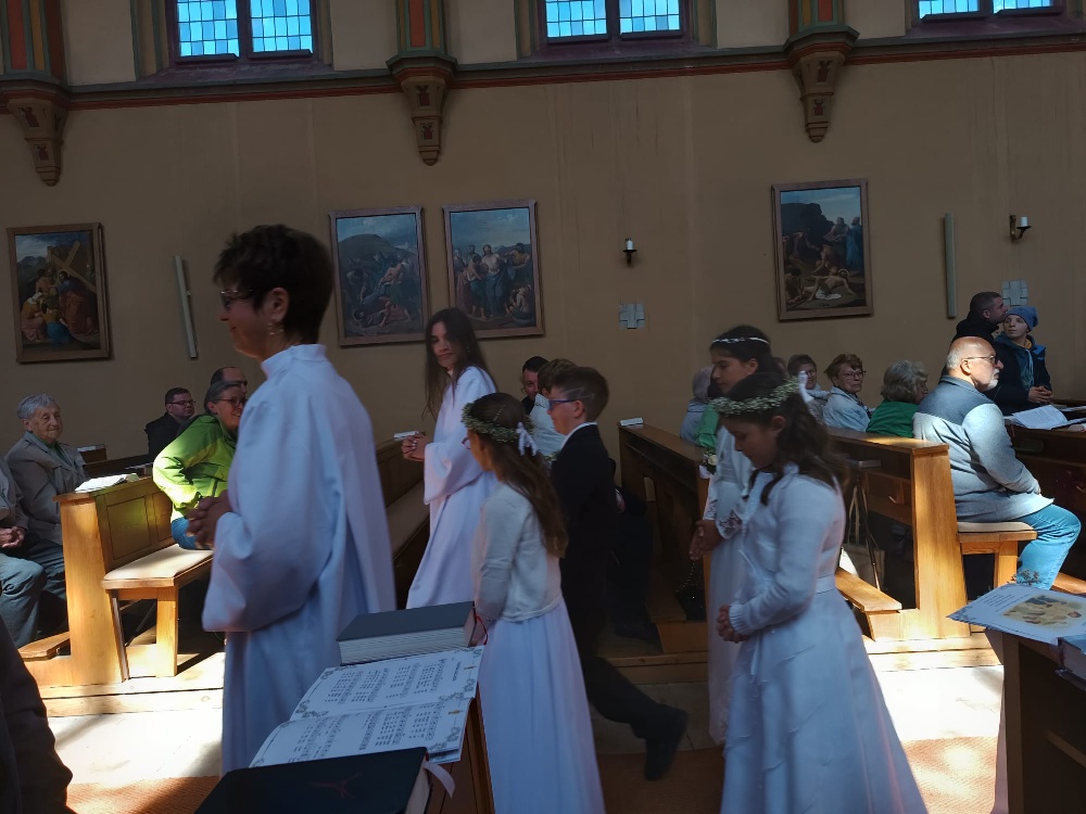 Frau Ilona Werner aus unserer Pfarrei und Pfarrer Styra waren bestrebt die Kinder immer tiefer in die Begegnung mit Jesus in der Heiligen Kommunion hineinzuführen. Trotz der kleinen Schar der vier Kinder aus drei Familien unserer Pfarrei war die Vorbereitung intensiv und aufschlussreich. Dank der Eltern und oft auch der Großeltern konnten die Treffen an verschiedenen Orten stattfinden und abwechslungsreich gestaltet werden.